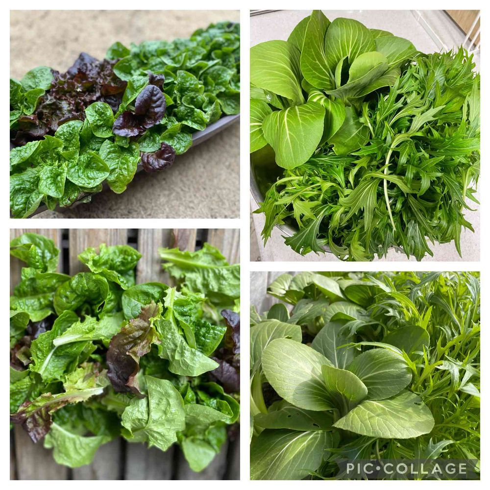 今朝採れの水菜と青梗菜とサラダミックス。この寒い中でも不織布の中で順調に育ってます💓