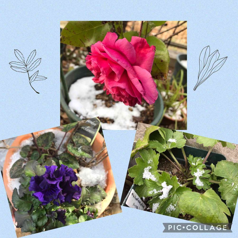 昨夜から雪が降り、朝はうっすら土の部分に積雪していました❄️天気が回復したのであっという間に溶けてしまいましたね😊上はラジオタイムズ(ER)。左はボール咲きのパンジー。右は3年目のラックスアリアドネ。