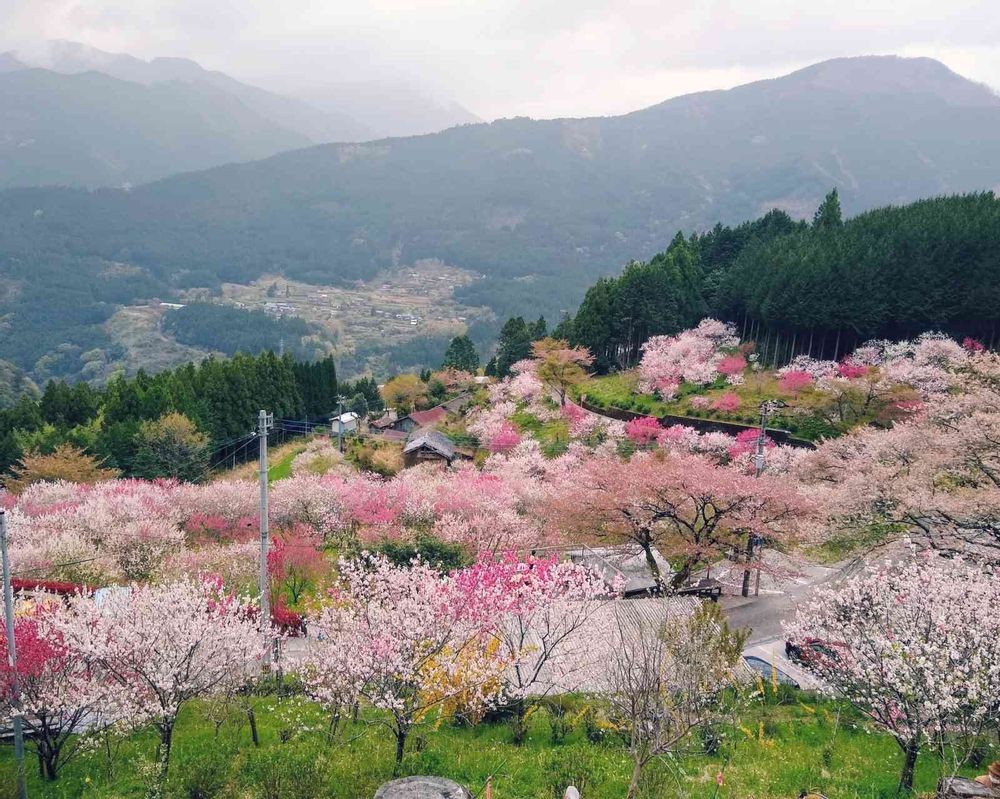 たくさんの桃の木🌸ピンク色の濃淡も可愛くて、奥の山並みをバックに幻想的な景色ですねー✨🌸😄