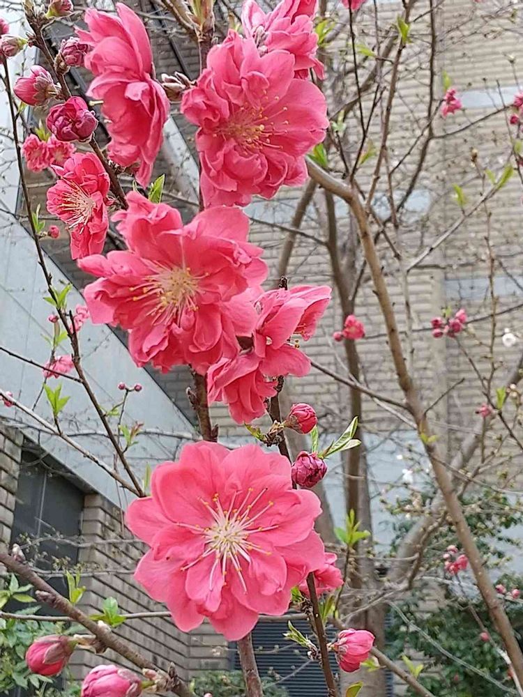 梅と間違えそうですが二つの花の違いは、花だけが咲いているのが梅で、葉と花が同時に咲いているのが桃だそうです。