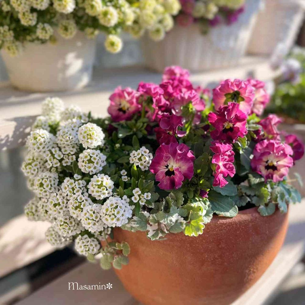 濃いピンク色💗のミルフルと白いアリッサムの寄せ植え💗🌿良くお似合いですね😃