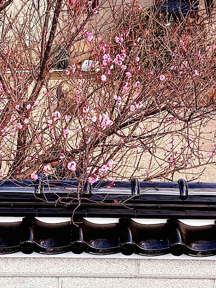 散策中に、通り道のお宅の塀の向こうに、紅梅の花が美しく咲いていました。