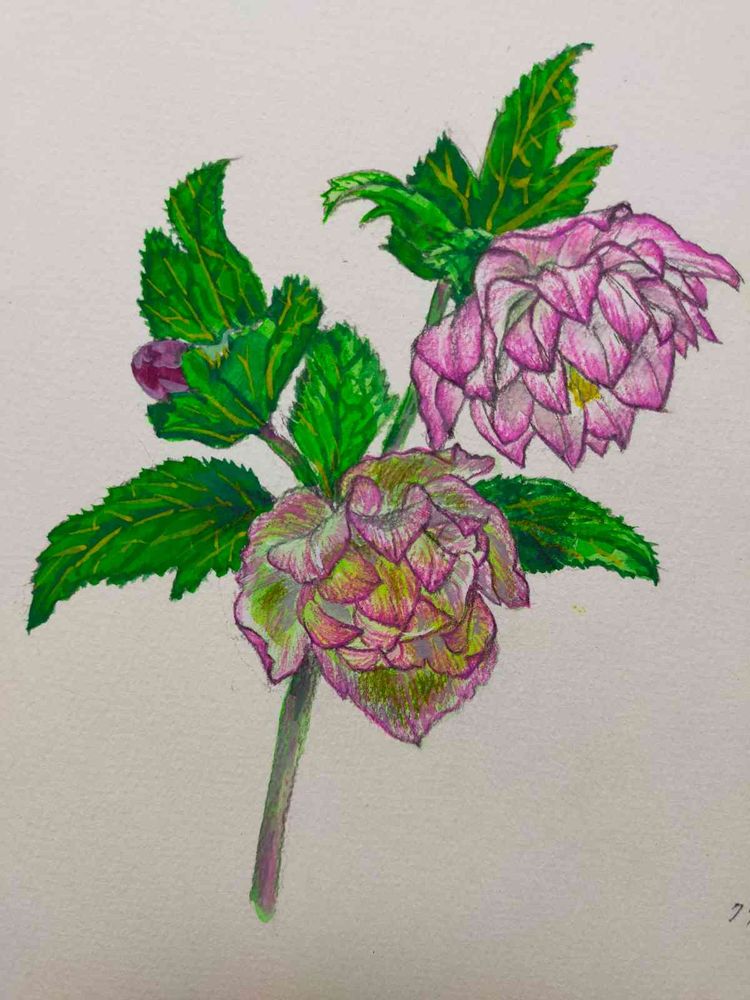 どの子もうつむき加減に咲いているので、リビングのテーブルの上に又、高めの台を置いて描いていました😆私はよく知らないのですが、色鉛筆も水に溶ける物が有るらしく水彩絵の具の他に水彩色鉛筆とか使って色の強弱を出しているようです😊