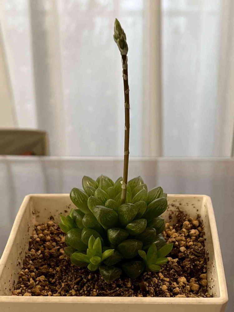 我が家にある 数少ない多肉の中で ハオルチアの真ん中から ニョッキリ 蕾が伸びてました😊💕