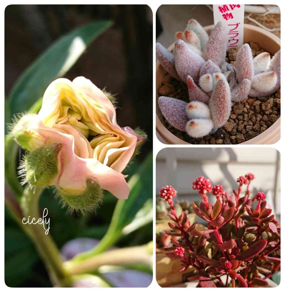 金曜日の蕾達。ラナンキュラス ラックス アリアドネが徐々に開き始めてきました。紅稚児もたくさんの蕾をつけて準備万端です。