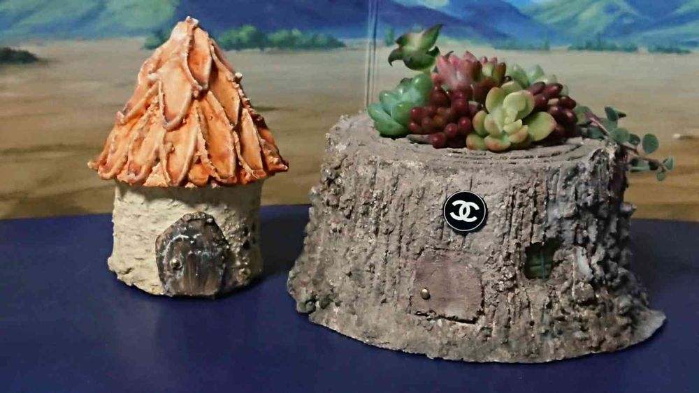 モルタル切株鉢に寄せ植えされたんですね。ミニハウスも可愛い
