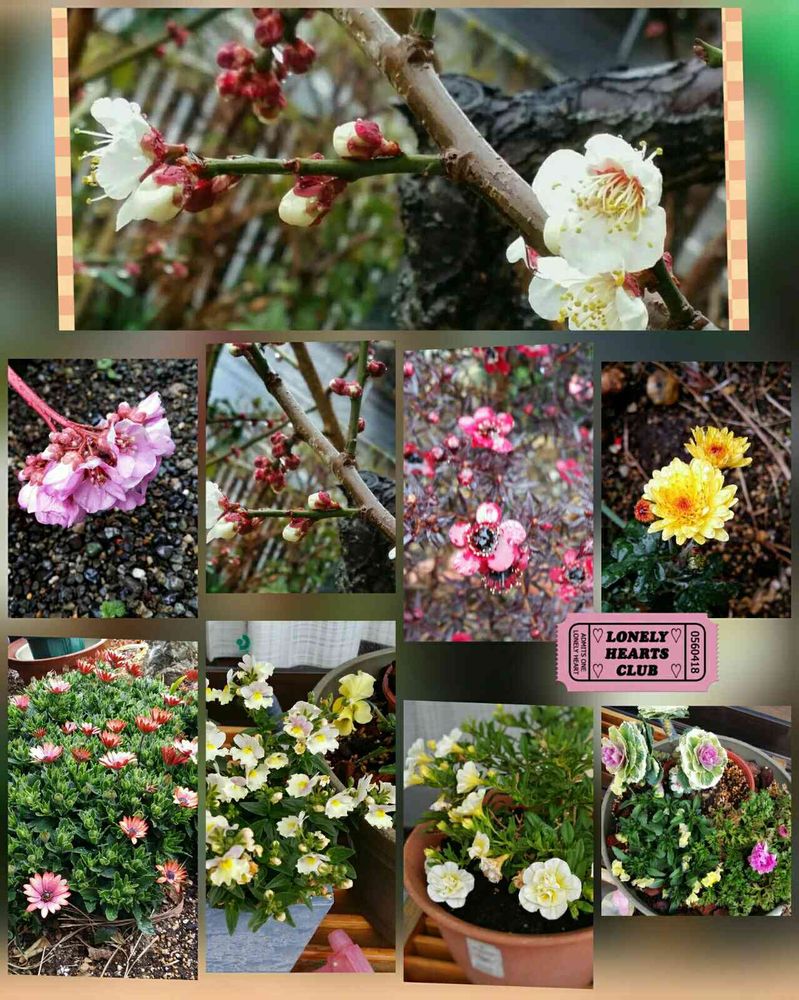 雪の下、ぎょりゅう梅、菊、オステオ(びっしりと)、ネメシア(香)、夏に咲くサフィニア系、正月飾り用の 葉牡丹(初買)ヴィオラ アネモネ