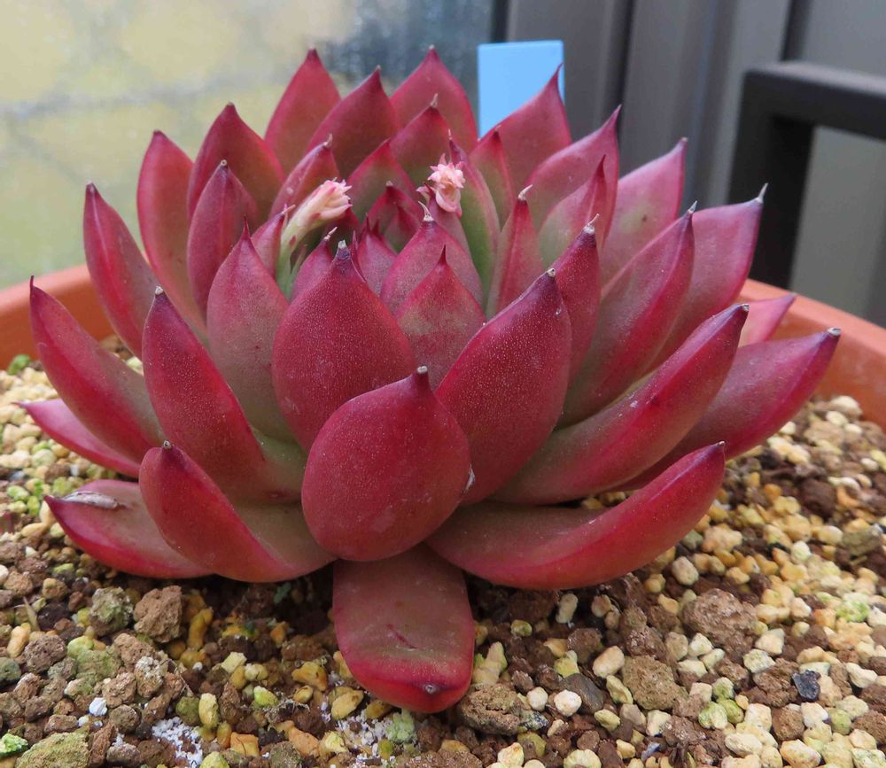真っ赤になってきたエケベリアのクリスマス。今日は雨なので暗めの色に見えるけど,実際はもう少し鮮やかな赤。