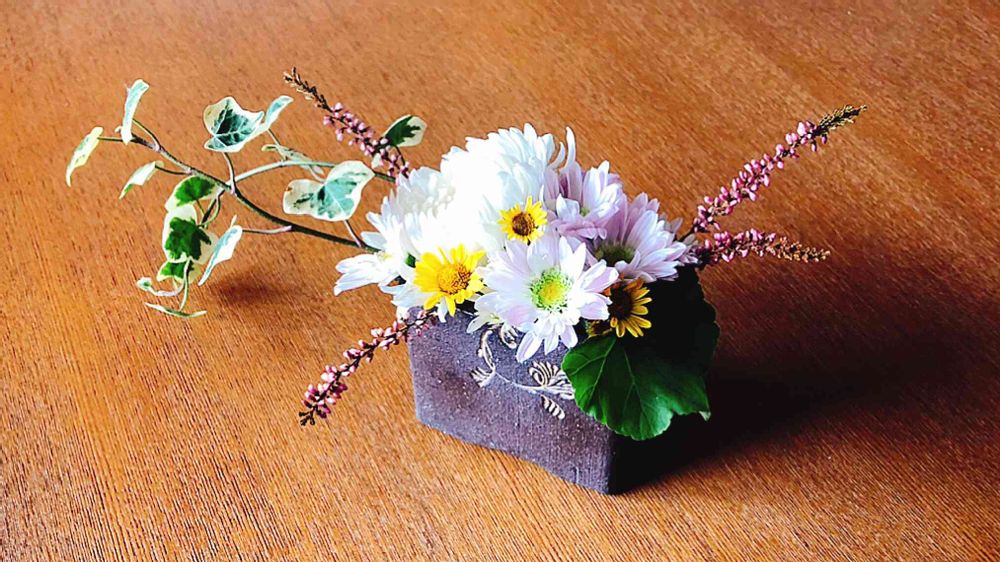 超長持ちな菊のリサイクル♻️花なんですね。たしかに菊やカーネーション、アルストロメリアは長持ちする花材の中でも優れものですね。カルーナがいいアクセントになっています。ただ自然な感じに見せるならかルーナが一ヶ所から広がっているように生けるとさらに良くなると思います