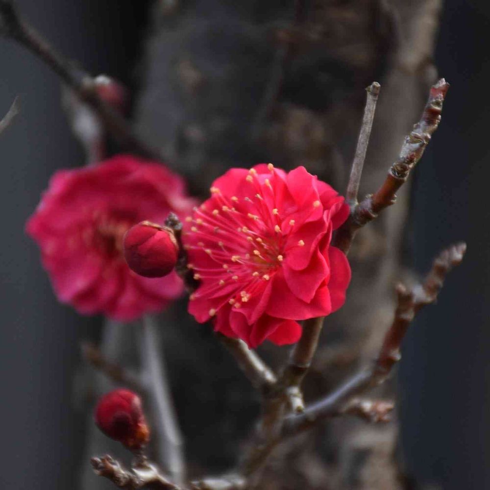 【研究学園の花々】2022年2月19日、筑波ハムつくば陣屋にひっそりと紅梅が咲いていました!