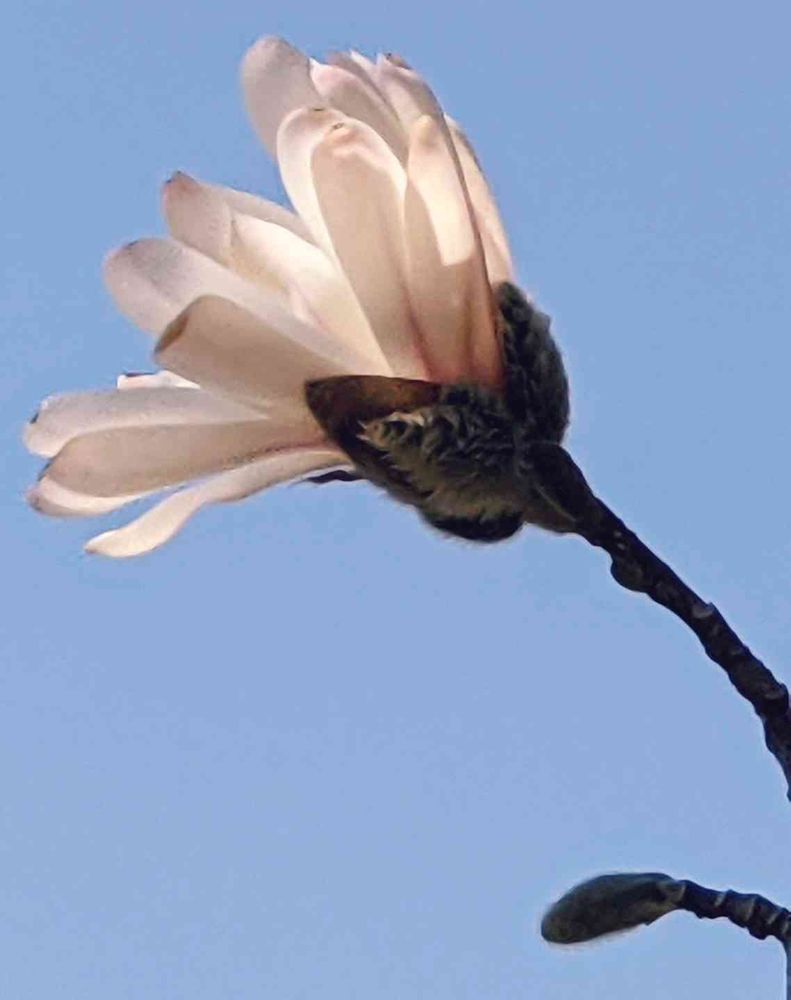 昨年3月、斜面のヒメコブシ(マグノリア)白花です。ピンクと白が隣り合って植えてあり、年々大きくなり楽しみですが、早晩全てヒヨドリさんのお腹の中に…。