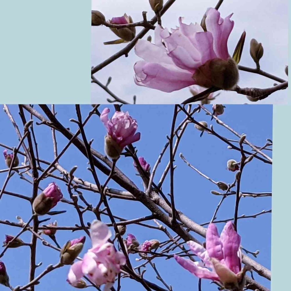 白花と隣合っているピンクのヒメコブシ(マグノリア)です。年々大きくなってお花が楽しみですが、早晩全てヒヨドリさんのお腹の中へ…。