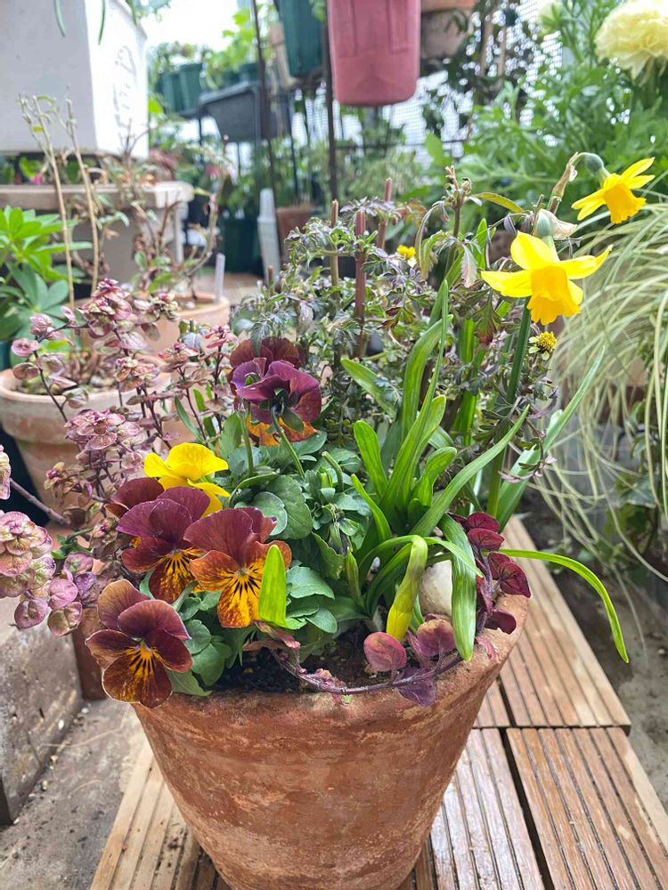 まずビオラ、後ろに薄い黄色のウィンターコスモス(一つしか咲いていないのでほぼお休み中😅)、発色の良いミニ水仙、オレガノは緑色ではなくブラウンを合わせています。鉢も荒い感じでワイルドな雰囲気を❣️