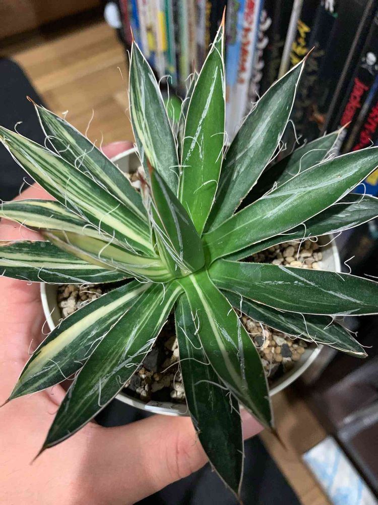 アガベの白糸の王妃錦。ベアルート株を購入し元旦に発根推進活動させて3日で根っこ出て1ヶ月で完全に発根。葉が開く。アガベの発根には市販の多肉の土と富士砂を1対1で混ぜてルートンが確実やな。水耕は何回か失敗してるし発根には富士砂最強説。アガベのある国は酸性雨降るしな酸性の富士砂が合うんや。多分。知らんけど。だから俺はアガベに富士砂が1番合ってると思う!知らんけど!