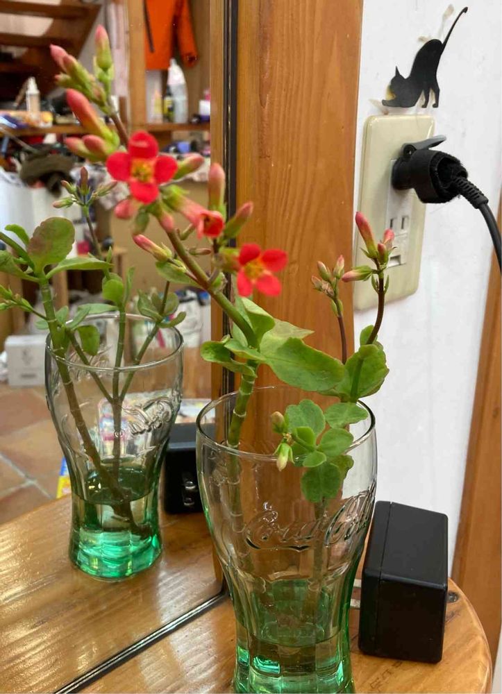 友人の美容院にカランコエを一枝枝持って行きました‼️見せたかったのはコンセントのスイッチの上の、ラシャ紙の黒猫ちゃん🐈⬛家に帰って、真似して乗せたのは言うまでもありません❣️