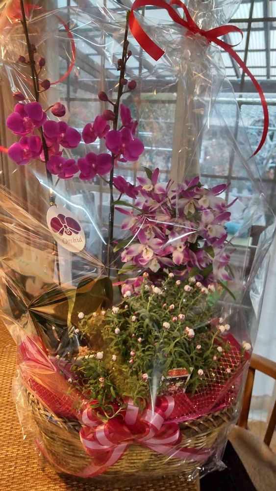 さん、主人に「古希だから紫の花を送って」って言われたんだけど、あんまり紫でもちょっと暗くなっちゃうかなと思って、ピンクっぽい紫色のお花を選びました🎶