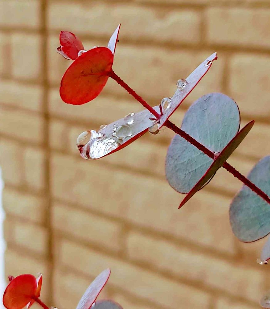 ユーカリの葉っぱ初めて見ました。水滴がキレイですね✨