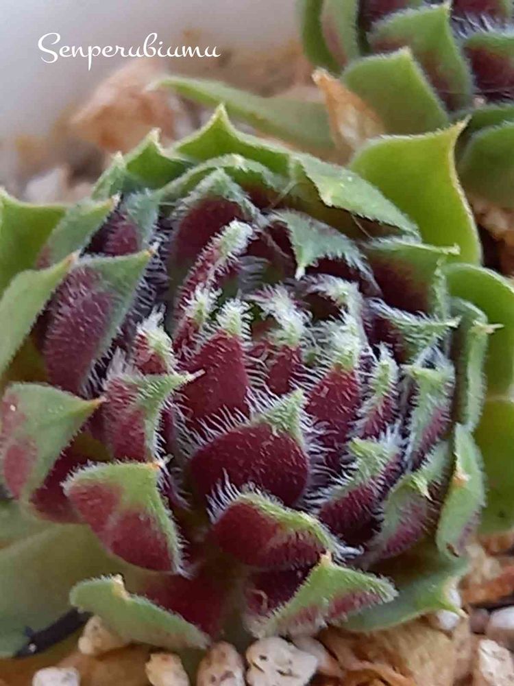 冬の寒さにあたって葉の色が紅葉したセンペルビュウム