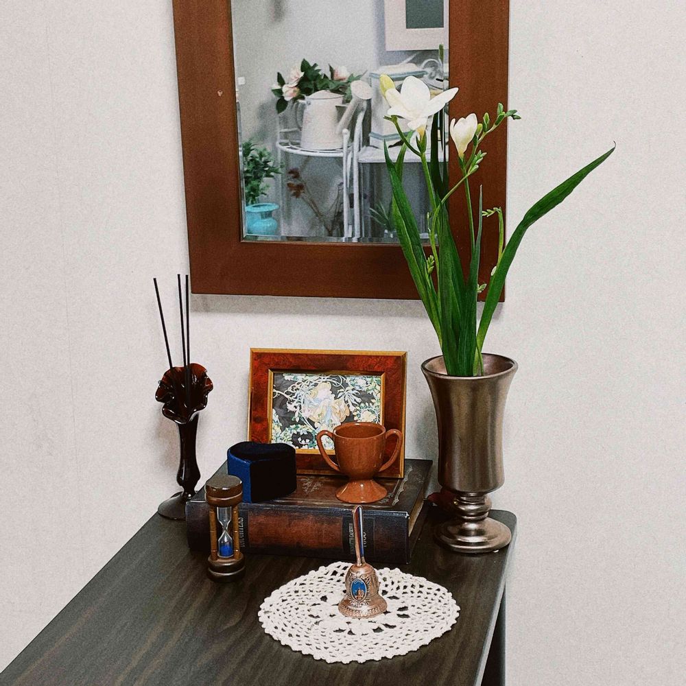 壁掛け仏壇「鏡壇ミラリエ」に今日(2/22)の誕生花の「フリージア(香雪蘭)」を飾ってみました。