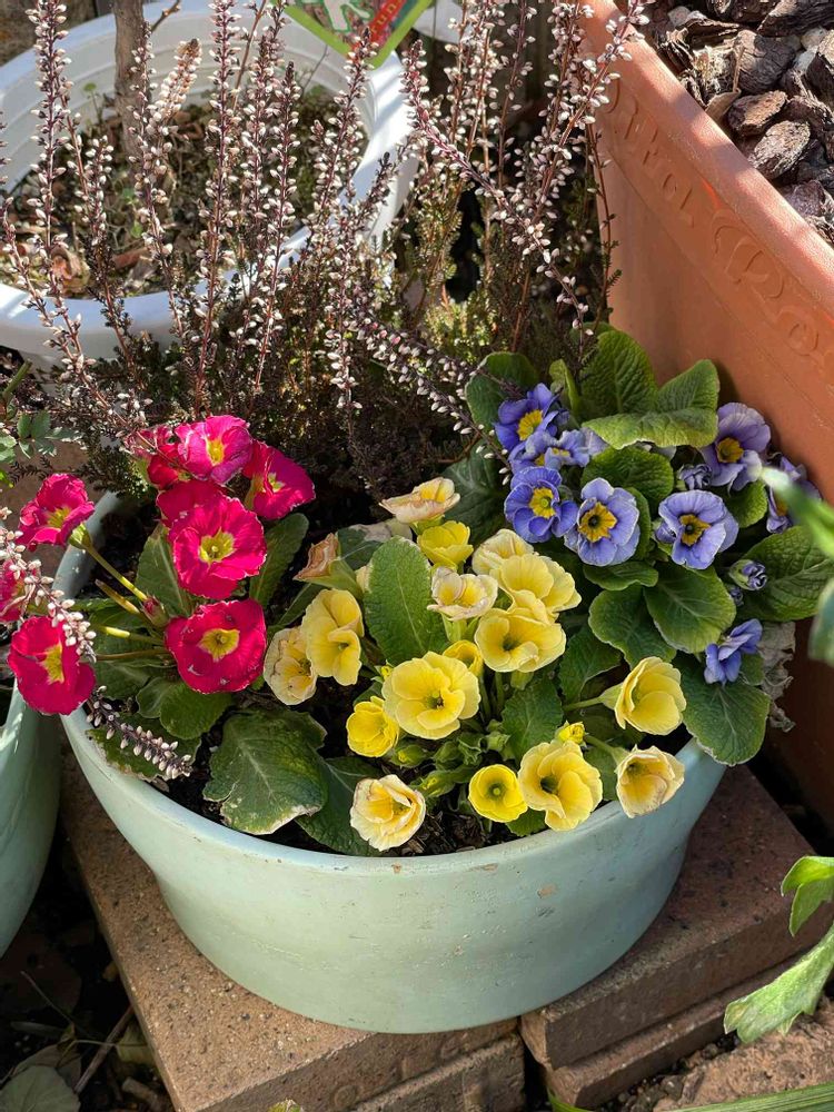プリムラ3ポットとカルーナ1ポットを使った寄せ植えです。