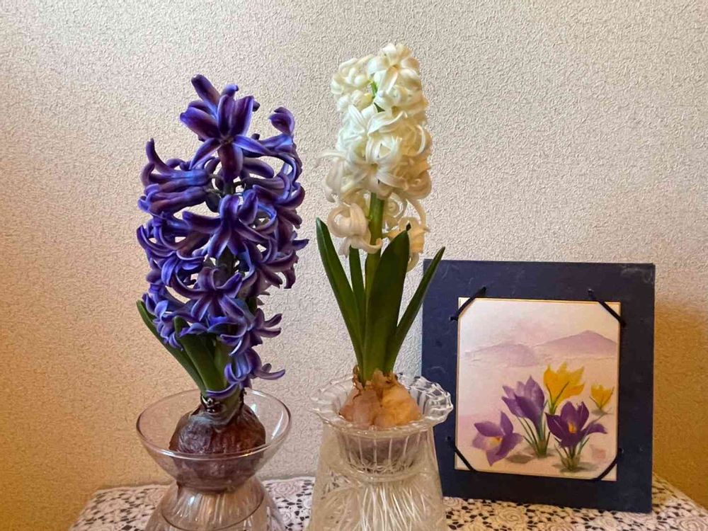 綺麗に咲きましたね🌹ヒアシンスさん🌸🌸 横の額のクロッカスさん🌸🌸もステキですね🌹🌹🌹
