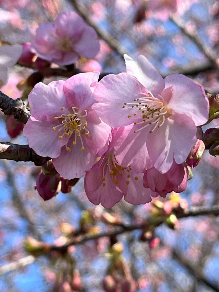 青💙い空に映えて咲き誇る河津桜🌸の華やぎ、眺めているだけで、思わず笑顔になってしまうなぁ☺🎵