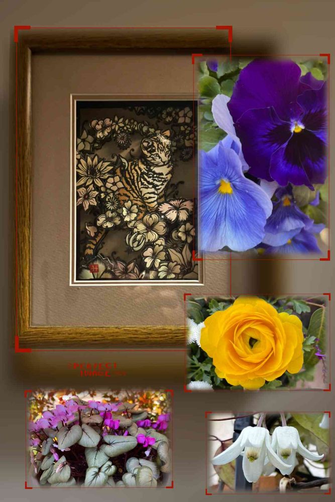 左の額、シャドーボックスなんですが、習っていた時に先生がどこからか手に入れたハガキ、どなたかの切り絵の個展の案内状でした。