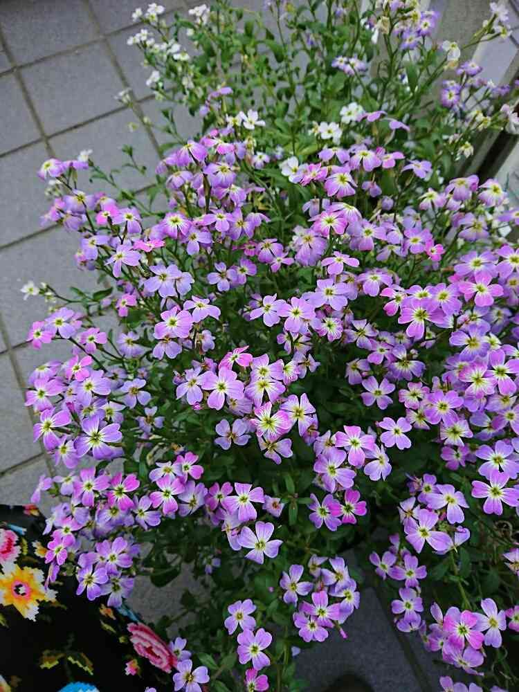 (手前に紫、奥は、ピンクと白と紫の寄せ植え)