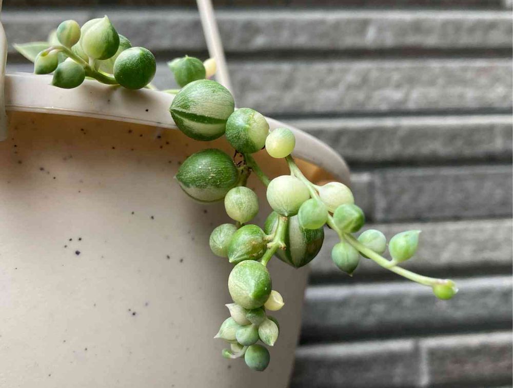 鉢の中のグリーンネックレスはバーコードみたいに並べています。