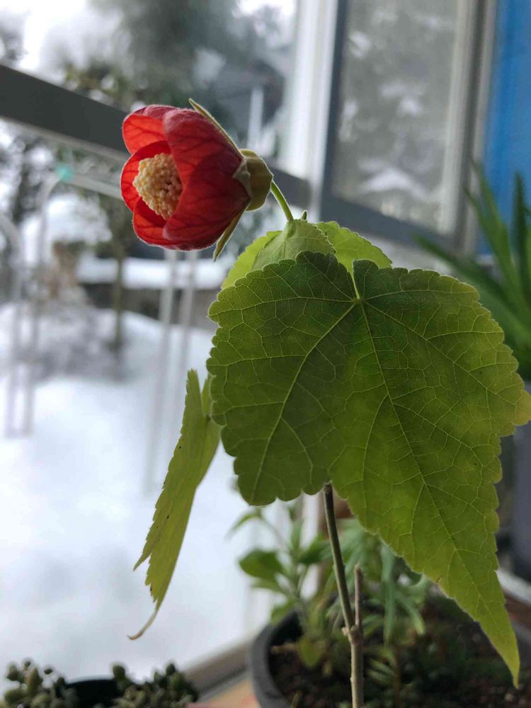 窓越しに観る雪景色に、早く春が来ないかなぁ!と言う様な表情を観せて咲き誇る、アブチロンの華やぎ素敵です!☺