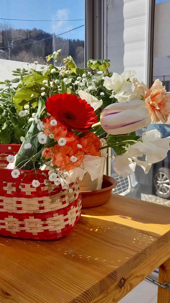かわいい籠🧺出来ましたね❤️この花束のチューリップ🌷うちのと同じだよ😁👍💗