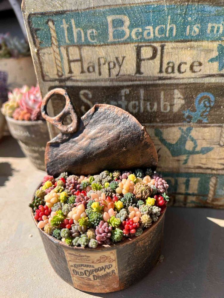 ちょっと渋めのリメ缶に可愛い色の多肉ちゃんが映えますね〜とってもステキ💖
