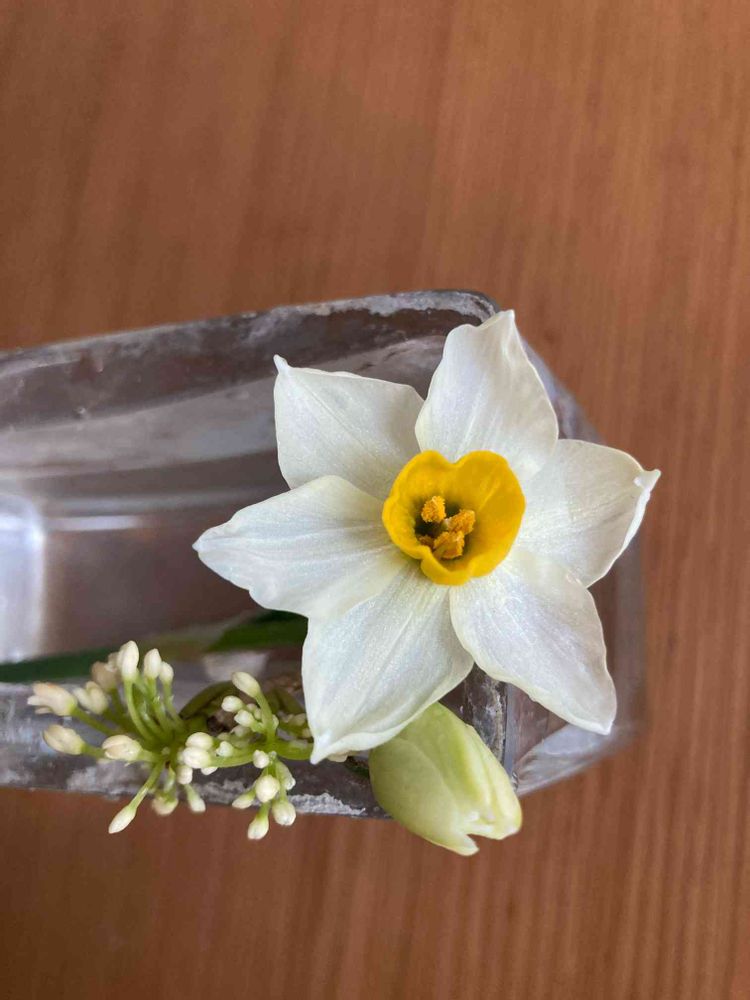 玄関脇の裏庭に倒れてた水仙が咲いてるのを見つけて、救出‼️銀木犀も蕾をつけたままいくつか咲いてました。開き切らないまま、冬に突入しちゃったのかな?こんなに寒い冬になるとは、知らずに…😨❄️
