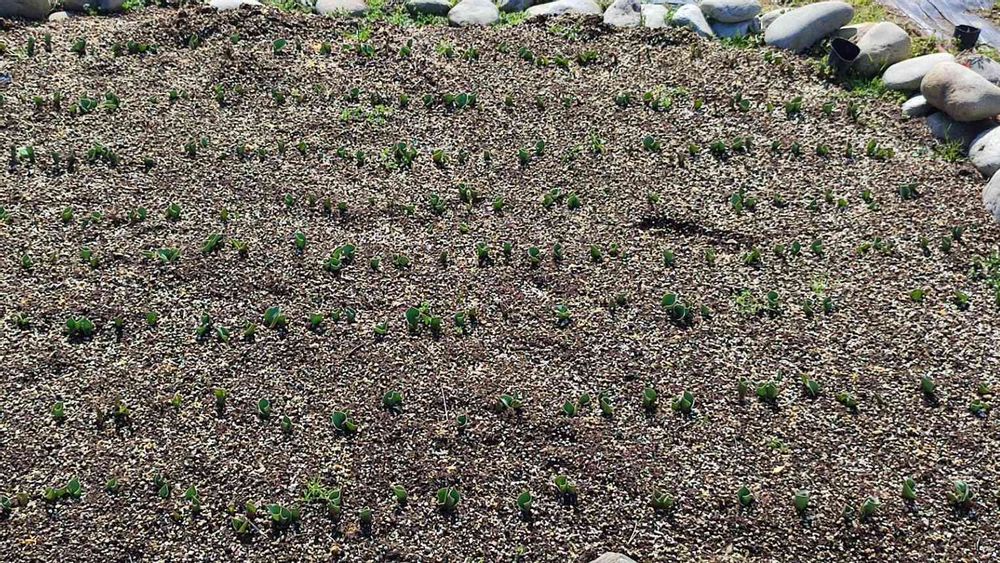だいぶんと発芽確認できるが、歪んでるし無いところもある。今年でこの球根も処分かなぁ?!