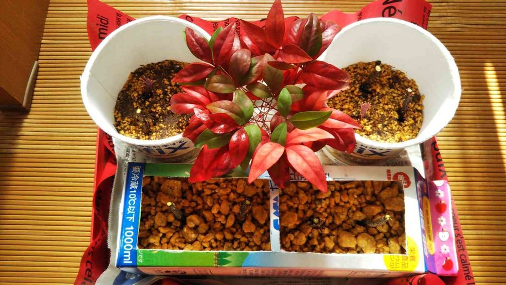 オタフクナンテン挿し木しました。牛乳パックとヨーグルトのカップ再利用です😁
