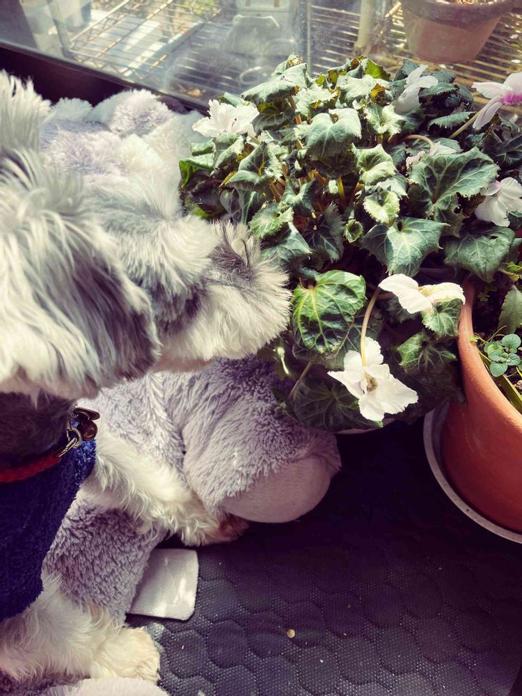 窓越しの暖かさで、シクラメンの隣でいびき掻いて寝てました🐶zzZZZZ