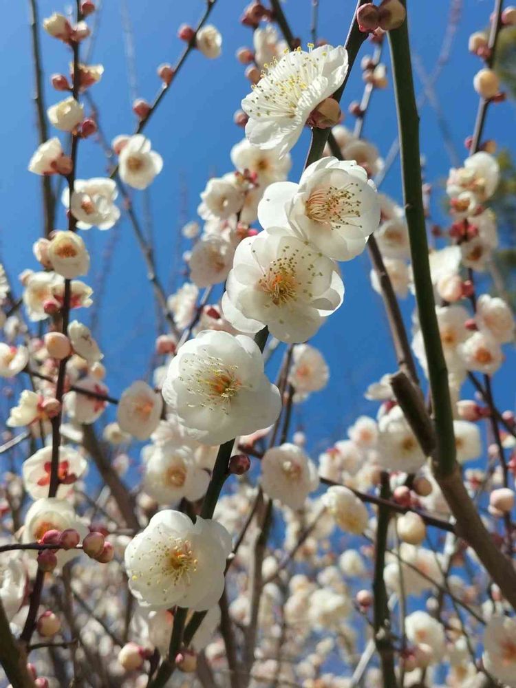 青いお空がお似合いの梅の花。白いお花が綺麗です。