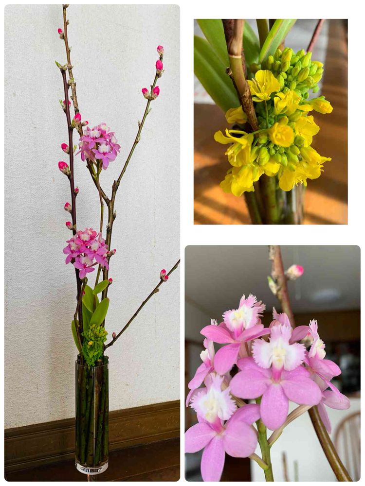 ピンクの可愛い蘭はエピデンドラム属💕ふっくら蕾の桃の花と菜の花🎶縦の線を強調してありフラワーベースの中にも緑のラインを 凛としつつ、優しいお花でした。