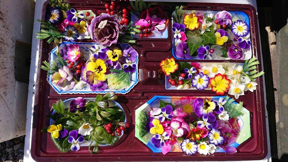 このお弁当の、容器綺麗だったので捨てる前に思い付いて花手水にしたんですよ、これも他の方の数人の投稿見て刺激になりやってみたんですけど中には真冬に容器に花を入れて氷らせた作品があってすごく良くて真似たんですけど愛知豊橋何ですけど気温があまり下がらなく何度も真冬に作ったけどダメでした。