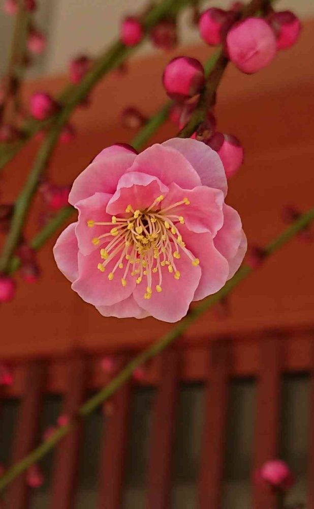 わー、朱色に紅梅が映えますね✨ つぼみもぷくぷくして愛らしいです💕💕