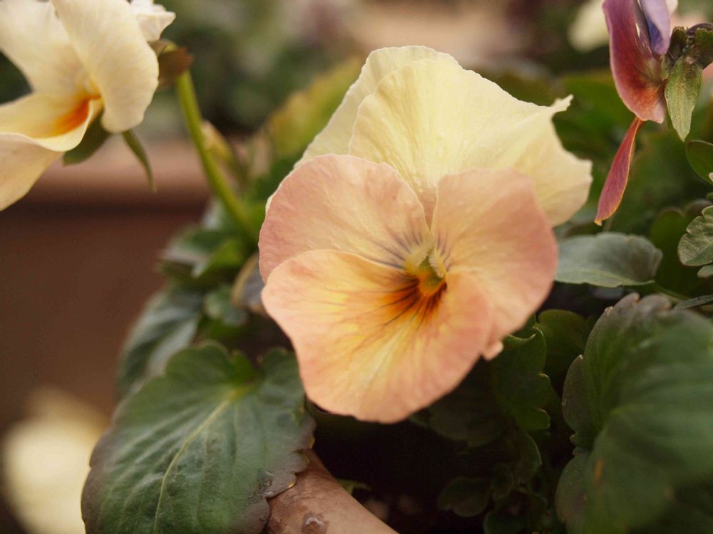 パンジー級の大きさのエボルべ。寒さのためか低い位置で咲いてしまいました。アイボリーと優しいピンクのビオラです。