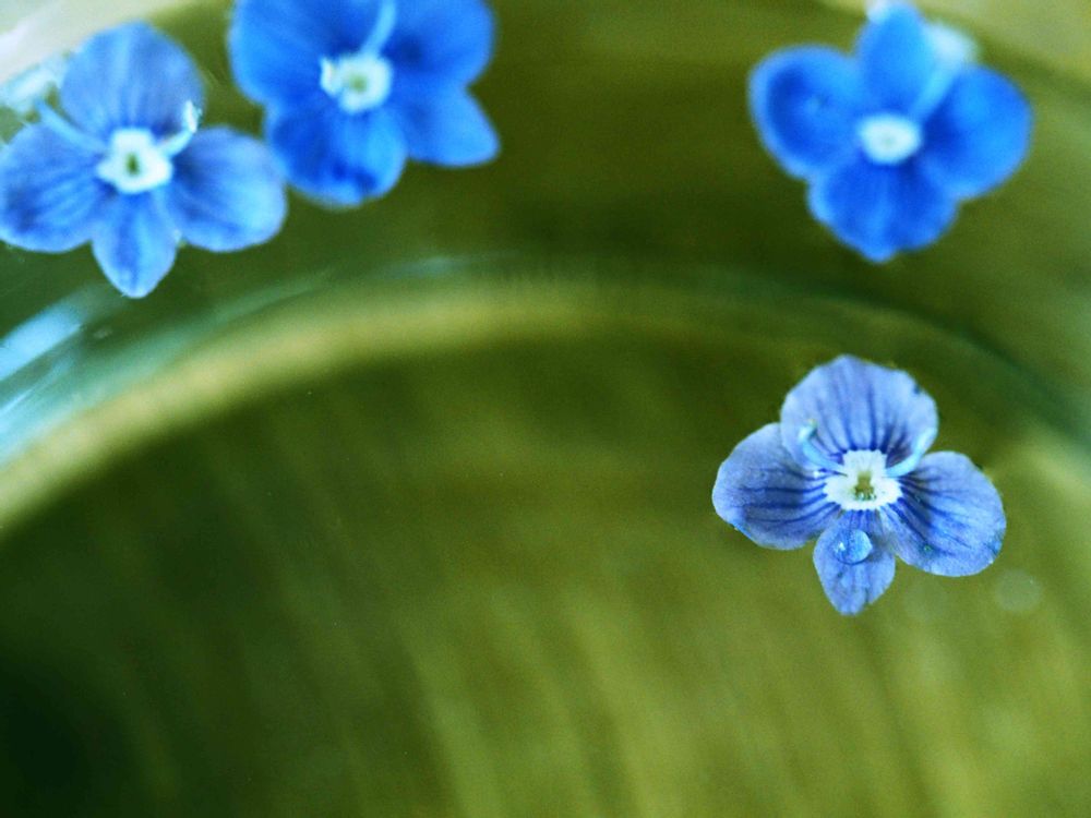 青い小花が風に吹き飛んで睡蓮鉢の中でゆらゆら
