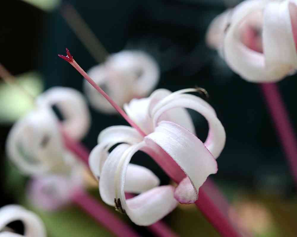 枝先に集散花序を出し、10~20cmほどもある紅紫白の花筒を放射状に伸ばす。