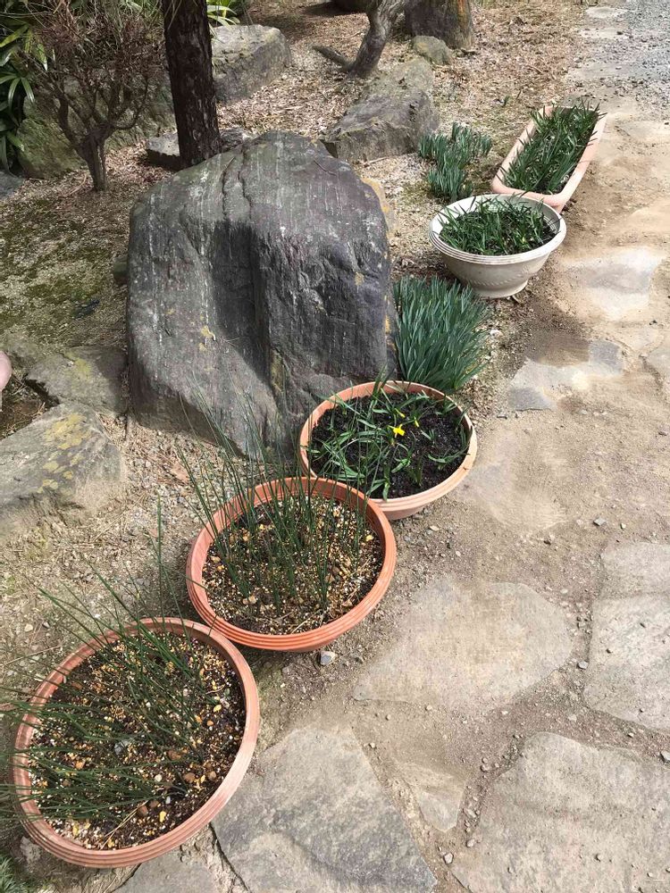 手前の香り水仙は冬の初めから姿が変わっていないように見えて、「おいおい、もっとやる気を出さんかい!😥」と思っていましたが、いつの間にか茎が伸びていて、その先端がうっすら黄色味を帯びてきました。写真ではわかりづらいですが。