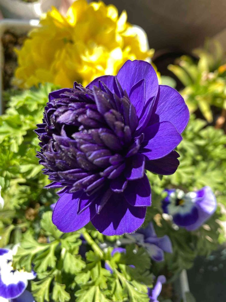 寄せ植えの八重咲きアネモネさんが開花始めました。2番花です。太陽☀️に照らされて紫色が弾けてます💜✨