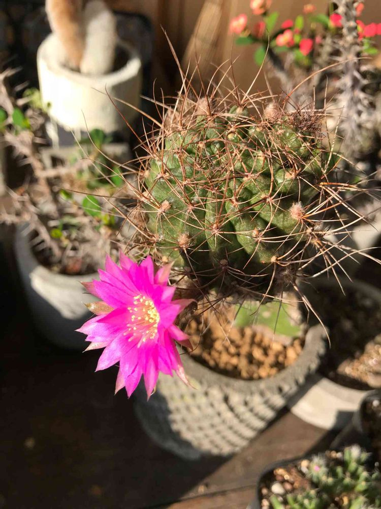 長槍丸も咲いています。花が無い時は地味で不細工なサボテンなのですが、この時期だけはとても綺麗です。まだまだ花芽が付いているので長く楽しませて貰えそうです。