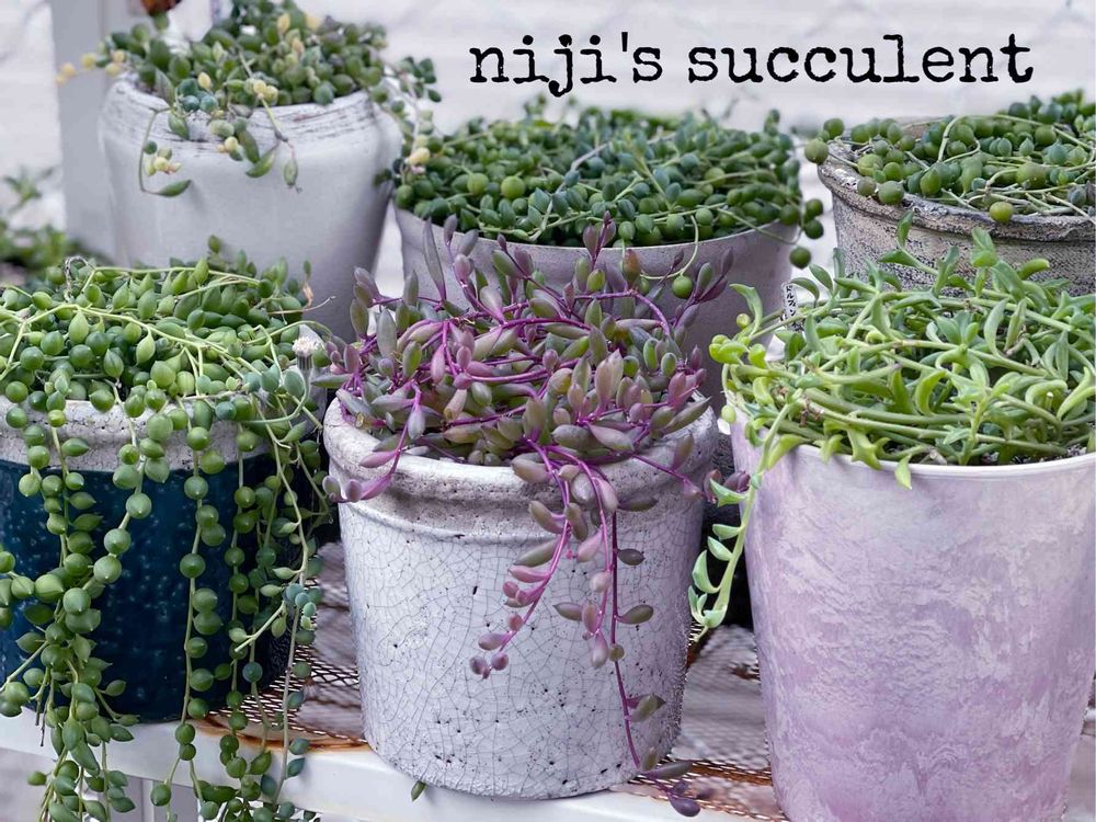 お恥ずかしいですが、伸びたら切って、何粒か外して、根元を多肉の土に挿すして、垂らしてると重量で落ちちゃうので、グルグル鉢に乗せて軽く多肉の土を足して、あとは水やり。こんな感じで増やしてますよ。外の棚に置いてるので、草花と同じタイミングで水やりしちゃうので、他の多肉より水やり回数多めですね⸜( ´ ꒳ ` )⸝