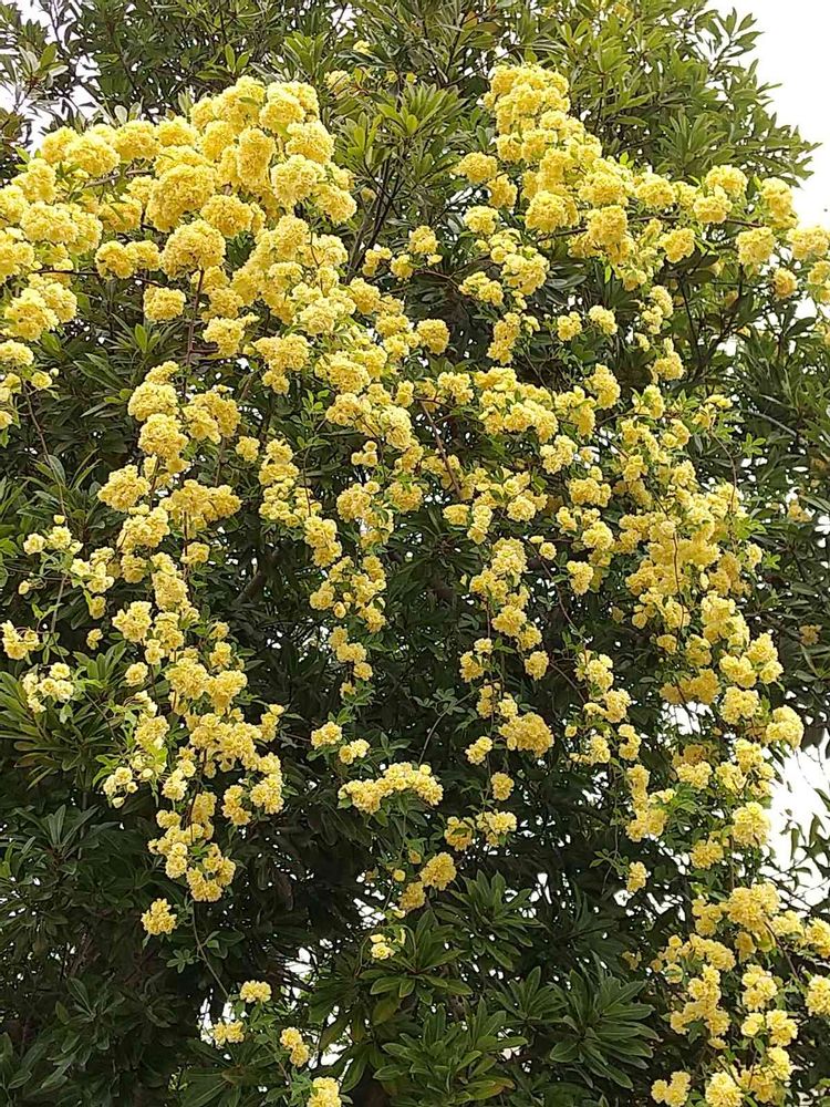 ヤマモモの樹にからみついたモッコウバラが、年々蔓を延ばしています🤗