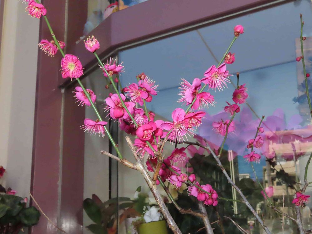 店先に鉢植えで綺麗に咲いた紅梅が置かれていました。 パチリ
