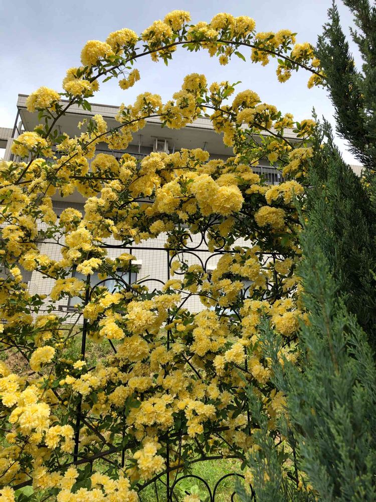 モッコウバラの向こうはお隣さんの敷地で、アーチのようにビョーンと伸びた枝が上手く左右に伸びたのだけ他の枝やトレリスに結び付けてるよ😆